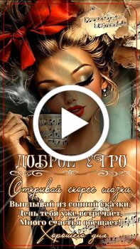 Красивое и вдохновляющее видео для пожелания доброго утра. На видео изображена эстетичная иллюстрация девушки с чашкой ароматного кофе. Девушка с выразительными глазами и красными губами держит чашку, украшенную музыкальными нотами, от которой идет легкий пар. Ее образ дополнен пышным красным бантом в волосах. Текст на видео приглашает проснуться и окунуться в магию нового дня, обещающего много счастья. Это идеальное видео для отправки близким, чтобы поднять настроение и подарить приятные эмоции с самого утра.