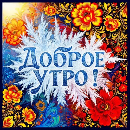 Яркая и праздничная открытка с надписью «Доброе утро!» на фоне традиционного русского народного орнамента в стиле хохломы. Композиция украшена пышными красными, оранжевыми и желтыми цветами, золотистыми завитками и растительным узором на глубоком синем фоне. В центре расположена белая ажурная снежинка или стилизованный морозный узор, создающий эффект сияния. Изображение наполнено теплом, радостью и уютом, идеально подходит для пожелания доброго утра в мессенджерах и социальных сетях.