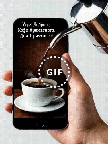 Эстетичное изображение, на котором рука держит смартфон, на экране которого отображается процесс наливания горячего ароматного кофе в белую чашку. Сверху на картинку накладывается текст на русском языке: "Утра Доброго, Кофе Ароматного, Дня Приятного!". Композиция создает эффект 3D: струя кофе как будто выливается из настоящего металлического чайника за пределами экрана прямо в виртуальную чашку. Идеально подходит для утренних приветствий, открыток в мессенджерах и создания позитивного настроения.