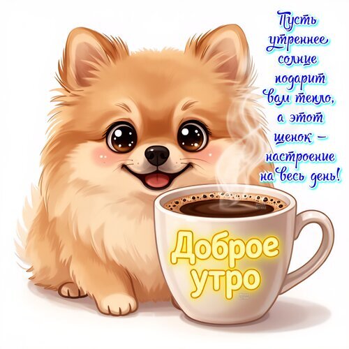 Милая и теплая иллюстрация с пушистым рыжим щенком породы померанский шпиц, который счастливо улыбается рядом с дымящейся чашкой кофе. Картинка наполнена уютом и позитивом, идеально подходит для создания доброго настроения. Текст на русском языке гласит: " Пусть утреннее солнце подарит вам тепло, а этот щенок — настроение на весь день!". Идеальный визуальный контент для поздравительных открыток, постов в социальных сетях и пожеланий доброго утра.