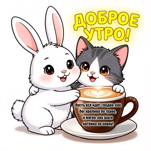 Милая и добрая открытка с изображением белого кролика и серого котенка, которые вместе сидят рядом с чашкой горячего кофе. На картинке надпись «Доброе утро!» и вдохновляющая цитата на русском языке о том, чтобы всё шло гладко, как бег кролика, и мягко, как шаги котенка. Идеально подходит для отправки друзьям, близким и любимым в мессенджерах и социальных сетях для создания позитивного настроения с самого утра. Мультяшный стиль, яркие цвета и уютная атмосфера.