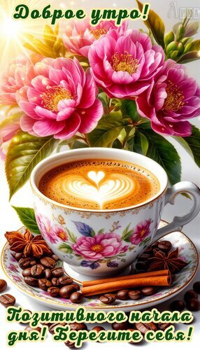 Красивая поздравительная открытка для доброго утра. На изображении крупным планом чашка ароматного кофе с изящным рисунком латте-арт в форме сердца, окруженная пышными розовыми пионами, кофейными зернами, палочками корицы и звездочками аниса. На картинке надпись на русском языке: " Доброе утро! Позитивного начала дня! Берегите себя!". Идеально подходит для отправки друзьям и близким в мессенджерах и социальных сетях для создания уютного и позитивного настроения.