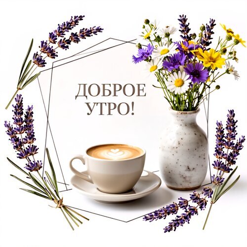 Эстетичное изображение для пожелания доброго утра, на котором запечатлена чашка ароматного капучино с нежным рисунком на пенке (латте-арт) в светлой чашке. Композицию дополняют изысканные веточки фиолетовой лаванды и яркие полевые цветы (ромашки и астр) в минималистичной белой вазе. Текст «Доброе утро!» написан элегантным шрифтом на светлом фоне, создавая атмосферу уюта, спокойствия и свежести. Идеально подходит для вдохновляющих утренних открыток, соцсетей и сторис.