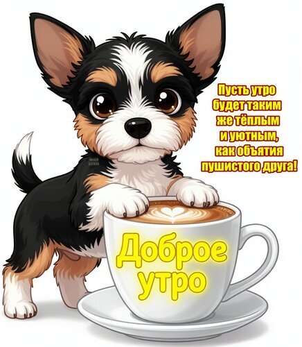 Милая и уютная цифровая иллюстрация с изображением очаровательного щенка (корги или джек-рассела) с большими выразительными глазами. Щенок стоит рядом с большой чашкой кофе, на пенке которой нарисовано сердечко. На картинке присутствует теплый поздравительный текст на русском языке: «Пусть утро будет таким же тёплым и уютным, как объятия пушистого друга!» и крупная надпись «Доброе утро» на самой чашке. Изображение выполнено в стиле мультяшного 3D-арта, идеально подходит для пожеланий доброго утра в социальных сетях, мессенджерах (WhatsApp, Telegram) и открыток.