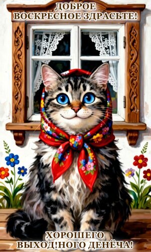Милая открытка с изображением пушистого полосатого котенка в красном цветочном платке. Котенок сидит на фоне окна с резными наличниками и белыми занавесками. На картинке расположены добрые пожелания на русском языке: «Доброе воскресное здрасьте!» сверху и «Хорошего выходного денёчка!» снизу. Яркая, уютная иллюстрация, идеально подходящая для отправки друзьям и близким в мессенджерах или социальных сетях для создания праздничного настроения в воскресенье.