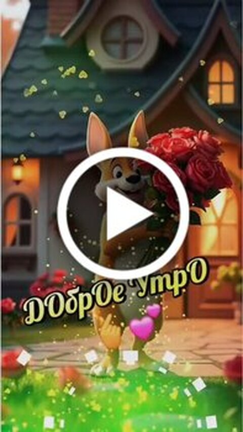 Красочное анимационное видео с пожеланиями доброго утра. Сюжет представляет собой яркую смену кадров с милыми антропоморфными персонажами. В видео сменяют друг друга очаровательные зайцы, мыши, петух, утка и пес, каждый из которых держит в руках пышные букеты цветов или чашку теплого напитка. Все персонажи расположены на фоне уютных загородных домов и живописной природы. Видео наполнено праздничной атмосферой благодаря летящим лепесткам, сердечкам и золотистым искрам. Постоянная надпись на русском языке "Добро утро" создает позитивное настроение и идеально подходит для отправки близким в качестве утреннего приветствия.