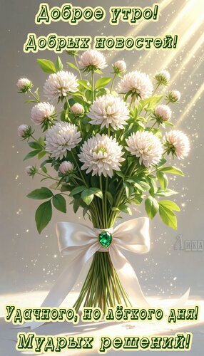 Красивая открытка с пожеланием доброго утра. На изображении представлен пышный букет нежных светлых цветов (похожих на хризантемы или астры) в зеленой листве, перевязанный элегантной белой атласной лентой с изумрудной брошью в центре. Фон светлый, с мягкими солнечными лучами и мерцающими искрами, создающими атмосферу уюта и радости. Текст на русском языке гласит: "Доброе утро! Добрых новостей! Удачного, но лёгкого дня! Мудрых решений!". Идеально подходит для отправки друзьям, близким и коллегам в мессенджерах и социальных сетях для поднятия настроения.