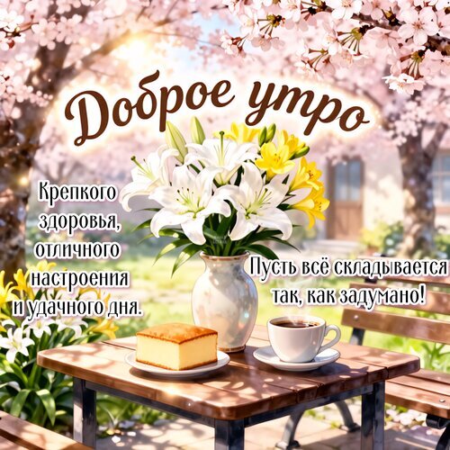 Красивая открытка «Доброе утро» с пышным букетом белых и желтых лилий на фоне цветущей сакуры. На переднем плане — чашка ароматного кофе и аппетитный десерт на деревянном столике. Уютная весенняя атмосфера, залитая солнечным светом. Идеальное изображение для пожелания доброго утра, вдохновения и хорошего настроения близким и друзьям.