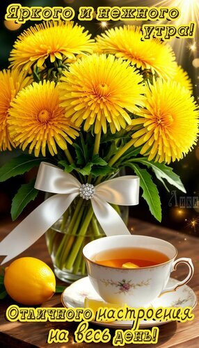 Красочное и позитивное изображение для пожелания доброго утра. На картинке представлен пышный букет ярко-желтых одуванчиков в стеклянной вазе, украшенной нарядным белым бантом с блестящей брошью. Рядом с вазой стоит чашка ароматного чая на блюдце, а рядом лежит спелый лимон, создавая атмосферу уютного и солнечного завтрака. На изображении добавлены вдохновляющие надписи на русском языке: «Яркого и нежного утра!» и «Отличного настроения на весь день!». Идеально подходит для открыток, поздравлений в мессенджерах и социальных сетях для поднятия настроения.