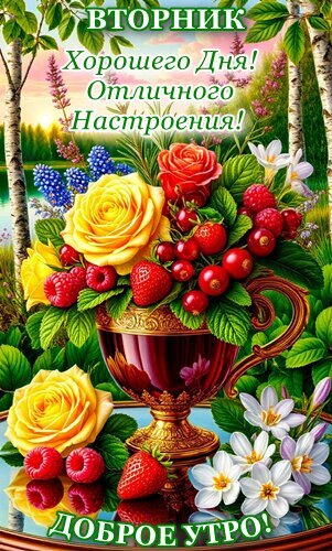 Красочная поздравительная открытка на вторник с пожеланиями хорошего дня и отличного настроения. На изображении представлен пышный букет из желтых и красных роз, спелых ягод клубники и малины, а также изящная ваза. Композиция дополнена белыми цветами и живописным природным фоном с березами и озером. Идеально подходит для отправки друзьям и близким в мессенджерах и социальных сетях для поднятия настроения в середине недели.