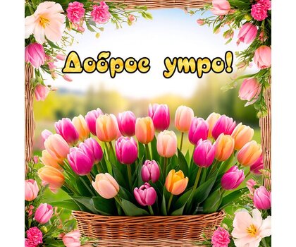 Красивая поздравительная открытка с надписью "Доброе утро!". На изображении представлен пышный букет разноцветных розовых и желтых тюльпанов в плетеной корзинке. Композиция украшена нежными цветами по периметру кадра, создавая атмосферу весеннего утра, уюта и радости. Идеально подходит для отправки в мессенджерах и социальных сетях для создания хорошего настроения близким и друзьям.