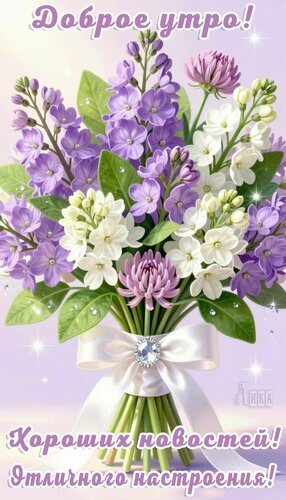 Красивая поздравительная открытка с пышным букетом фиолетовых и белых цветов (сирени или гортензий), перевязанным изящным белым бантом с блестящим камнем. На картинке надпись на русском языке: «Доброе утро! Хороших новостей! Отличного настроения!». Фон нежно-сиреневый с эффектом сияния и мерцающих искр. Идеально подходит для отправки в мессенджерах и соцсетях для пожелания доброго утра и позитивного настроя.