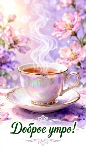 Эстетичное и вдохновляющее изображение для пожелания доброго утра. На картинке запечатлена чашка дымящегося горячего чая или кофе в изысканной фарфоровой чашке с золотистой каемкой, стоящая на блюдце. Фон наполнен нежными розовыми и фиолетовыми цветами в мягком размытии (боке) с мерцающими бликами света. В нижней части кадра расположена красивая каллиграфическая надпись на русском языке «Доброе утро!». Изображение передает атмосферу уюта, тепла, нежности и прекрасного начала нового дня. Идеально подходит для отправки в мессенджерах, соцсетях и для создания открыток.