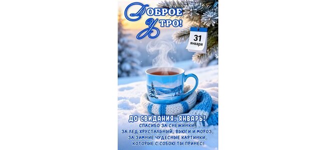 Открытка "ДОБРОЕ УТРО! 31 ЯНВАРЯ. ДО СВИДАНИЯ, ЯНВАРЬ! СПАСИБО ЗА СНЕЖКИ, ЗА ЛЕД ХРУСТАЛЬНЫЙ, ВЬЮГИ И МОРОЗ, З"