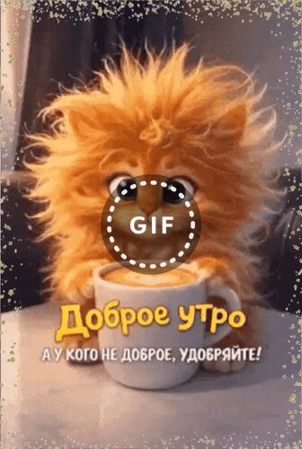 Милая и пушистая открытка с изображением рыжего котенка с большими выразительными глазами, который держит чашку кофе или какао. На картинке присутствует поздравительная надпись на русском языке: «Доброе утро, а у кого не доброе, удобряйте!». Изображение выполнено в теплых тонах, имеет декоративную сверкающую рамку, создающую уютное и позитивное настроение. Идеально подходит для отправки в мессенджерах и социальных сетях для создания хорошего настроения с самого утра.