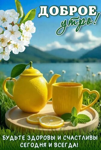 Красочная открытка с пожеланием доброго утра. На переднем плане изображены ярко-желтый чайник и кружка на деревянном подносе, дополненные дольками лимона и свежей мятой. Фон представляет собой живописный летний пейзаж с озером, горами и цветущей вишней под голубым небом. В верхней части надпись «ДОБРОЕ утро!», в нижней — «БУДЬТЕ ЗДОРОВЫ И СЧАСТЛИВЫ СЕГОДНЯ И ВСЕГДА!». Идеально подходит для отправки друзьям и близким в мессенджерах и социальных сетях для создания позитивного настроения.