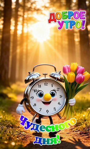 Яркая и позитивная открытка для пожелания доброго утра. На изображении запечатлен милый мультяшный будильник с улыбающимся лицом, который держит букет нежных розовых и желтых тюльпанов. Действие происходит в солнечном лесу, где сквозь деревья пробиваются теплые утренние лучи света, создавая атмосферу уюта и вдохновения. Крупный текст на русском языке «ДОБРОЕ УТРО! ЧУДЕСНОГО ДНЯ!» делает картинку идеальной для отправки друзьям и близким в мессенджерах и социальных сетях для поднятия настроения.