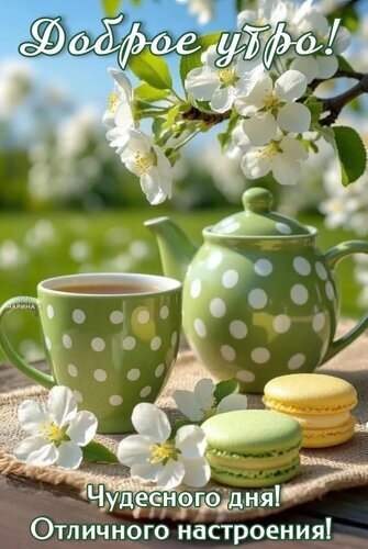 Красивая открытка с пожеланием доброго утра в весеннем стиле. На изображении уютный натюрморт: зеленая керамическая кружка и чайник в белый горошек, чашка ароматного чая, аппетитные пирожные макарон (macarons) и нежные цветущие ветки яблони. Атмосфера тепла, весеннего цветения и безмятежности. Идеально подходит для отправки друзьям и близким в мессенджерах и социальных сетях для поднятия настроения.