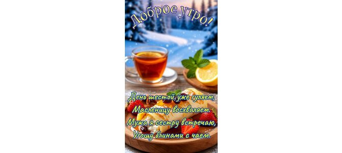 Открытка "Доброе утро. День шестой уже гуляем. Масленицу восхваляем. Мужа я сестру встречаю, угощу блинами с ч"