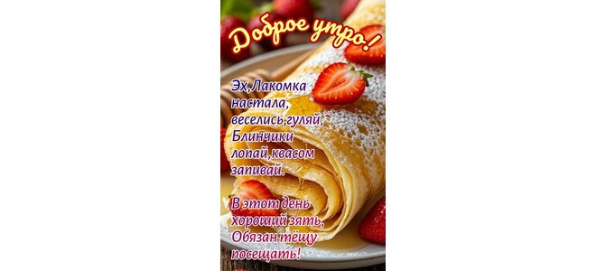 Открытка "Доброе утро! Эх, лакомка настала, веселись, гуляй. Блинчики лопай, квасом запивай."