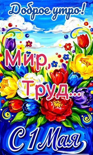 Яркая праздничная открытка, посвященная 1 Мая — Дню международной солидарности трудящихся. На фоне голубого неба с белыми облаками изображен пышный букет разноцветных цветов: красных, желтых, синих и фиолетовых тюльпанов и пионов. На картинке расположены поздравительные надписи на русском языке: «Доброе утро!», «Мир, Труд...» и «С 1 Мая». Изображение выполнено в сочном, насыщенном стиле с декоративными завитками, создавая праздничное и оптимистичное настроение. Идеально подходит для отправки поздравлений в мессенджерах и социальных сетях.