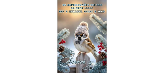 Открытка "ДОБРОЕ УТРО! НЕ ПЕРЕЖИВАЙТЕ ВЫ ТАК ЗА ЭТОТ СНЕГ! НЕТ В ДЕКАБРЕ, БУДЕТ В МАЕ!"