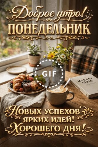 Анимированная открытка "Доброе утро! Понедельник. Новых успехов, ярких идей! Хорошего дня!"