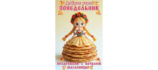 Открытка "ДОБРОЕ УТРО! ПОНЕДЕЛЬНИК. ПОЗДРАВЛЯЮ С НАЧАЛОМ МАСЛЕНИЦЫ!"