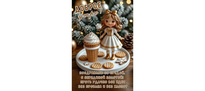 Открытка "ДОБРОЕ УТРО! ПОЗДРАВЛЯЮ СО СРЕДОЙ, С СРЕДИНОЙ ЗОЛОТОЙ! ПУСТЬ УДАЧНО ВСЕ ИДЕТ БЕЗ ПРОБЛЕМ И БЕЗ ХЛОПО"