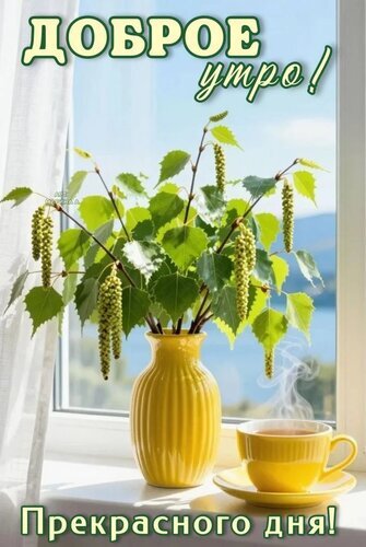 Красивая открытка для пожелания доброго утра. На изображении представлен ярко-желтый вазовый сосуд с ветками березы и зелеными серёжками, стоящий на подоконнике. Рядом находится чашка горячего чая или кофе с поднимающимся паром. Фон — светлый вид из окна на спокойный пейзаж с водой и горами под ясным небом. В верхней части надпись «ДОБРОЕ утро!», в нижней — «Прекрасного дня!». Идеально подходит для отправки в мессенджерах и социальных сетях для создания позитивного настроения.