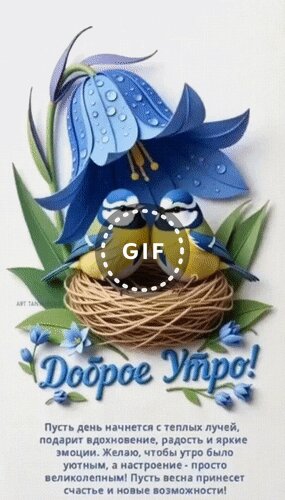 Красивая поздравительная открытка с изображением двух синиц, сидящих в уютном гнезде под огромным синим колокольчиком с каплями росы. Иллюстрация выполнена в нежных весенних тонах с использованием эффекта бумажной аппликации. На картинке присутствует надпись на русском языке «Доброе утро!», а также вдохновляющее пожелание доброго дня, радости и новых возможностей. Идеально подходит для отправки в мессенджерах и социальных сетях для создания весеннего настроения.