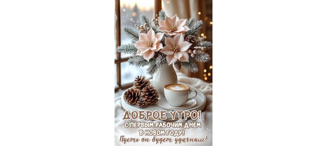 Открытка "ДОБРОЕ УТРО! С ПЕРВЫМ РАБОЧИМ ДНЕМ В НОВОМ ГОДУ! ПУСТЬ ОН БУДЕТ УДАЧНЫМ!"