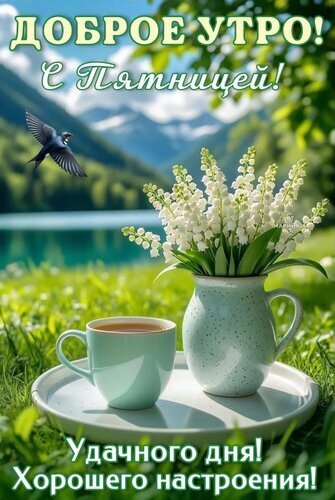 Красивая поздравительная открытка на утро пятницы. На фоне живописного горного пейзажа с озером и лесом изображен уютный завтрак: чашка кофе или чая и ваза с нежными белыми цветами (ландышами) на подносе. Надписи на русском языке: «Доброе утро! С Пятницей!» и «Удачного дня! Хорошего настроения!». Идеально подходит для отправки друзьям и близким в мессенджерах и соцсетях для создания позитивного настроя на весь день.