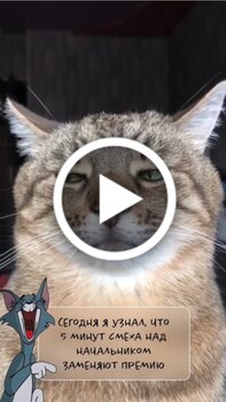 В этом коротком юмористическом видео крупным планом показана морда серьезного полосатого кота с выразительным взглядом. На фоне изображения персонажа мультфильма Тома из Тома и Джерри появляется текстовая плашка с ироничным утверждением о том, что сегодня герой узнал факт, согласно которому пять минут смеха над начальником заменяют полноценную премию. Видео представляет собой короткий комедийный ролик, построенный на жизненном юморе и ироничном отношении к работе и руководству.