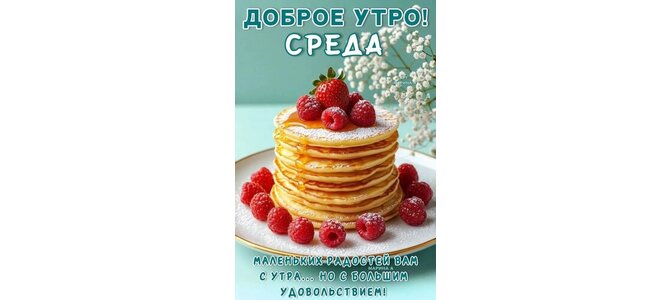 Открытка "ДОБРОЕ УТРО! СРЕДА. МАЛЕНЬКИХ РАДОСТЕЙ ВАМ С УТРА... НО С БОЛЬШИМ УДОВОЛЬСТВИЕМ!"