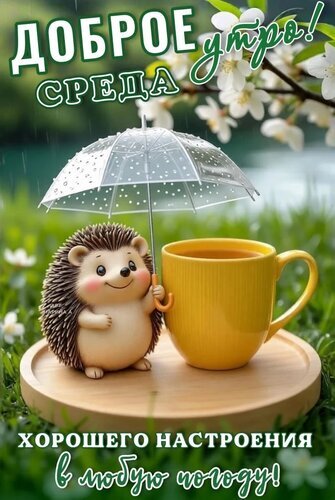 Милая и уютная поздравительная открытка на среду. На изображении очаровательный маленький ежик, который стоит под прозрачным зонтиком рядом с большой чашкой теплого напитка. Композиция расположена на деревянном подносе на фоне цветущей природы и зелени. Текст на русском языке гласит: «Доброе утро! Среда. Хорошего настроения в любую погоду!». Идеально подходит для отправки друзьям и близким в мессенджерах и социальных сетях для создания позитивного настроения в середине недели.