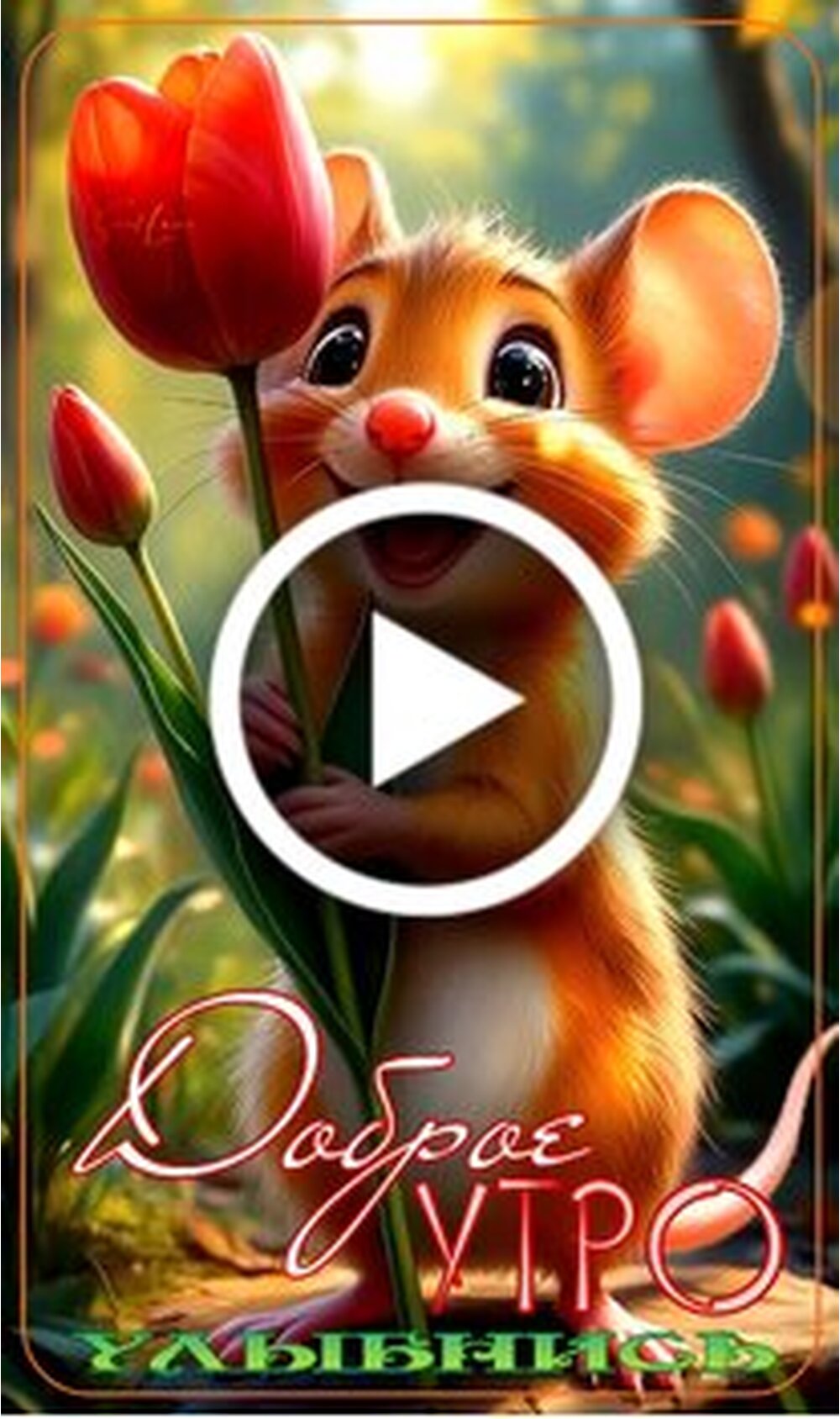 На этом видео представлено милое и позитивное анимационное приветствие для начала дня. Сюжет сосредоточен на очаровательном улыбающемся мышонке с большими глазами, который радостно держит в лапках яркий красный тюльпан. Вокруг персонажа и цветов плавно пролетают полупрозрачные сердечки, создавая атмосферу нежности и тепла. На переднем плане расположена надпись на украинском языке Доброе утро, что делает это видео идеальным способом пожелать хорошего настроения близким и друзьям. Солнечный свет и мягкая цветовая гамма подчеркивают праздничное и доброе настроение ролика.
