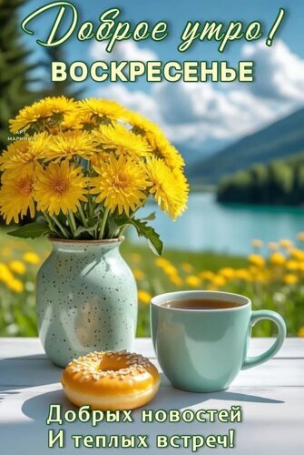 Красивая поздравительная открытка на воскресенье с ярким букетом желтых цветов (нимфей или декоративных одуванчиков) в вазе. На переднем плане уютный завтрак: чашка горячего кофе или чая и аппетитный пончик. Фон представляет собой живописный пейзаж с озером и горами под голубым небом. На картинке расположены надписи на русском языке: «Доброе утро! ВОСКРЕСЕНЬЕ» сверху и пожелание «Добрых новостей И теплых встреч!» снизу. Идеально подходит для отправки друзьям и близким в мессенджерах и социальных сетях для создания праздничного настроения утром в воскресенье.