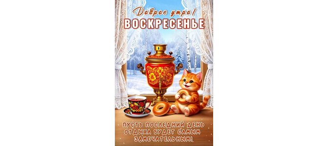 Открытка "ДОБРОЕ УТРО! ВОСКРЕСЕНЬЕ. ПУСТЬ ПОСЛЕДНИЙ ДЕНЬ ОТДЫХА БУДЕТ САМЫМ ЗАМЕЧАТЕЛЬНЫМ!"