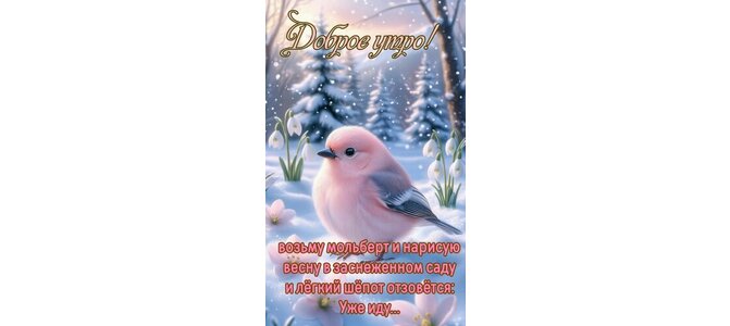 Открытка "Доброе утро. Возьму мольберт и нарисую весну в заснеженном саду"