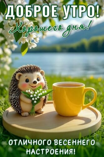 Красивая поздравительная открытка на доброе утро с милым маленьким ежиком. На переднем плане на деревянном подносе стоит желтая чашка горячего кофе или чая и ежик, держащий букетик нежных ландышей. Фон представляет собой живописный весенний пейзаж с озером, горами и цветущими деревьями. Текст на картинке на русском языке: «ДОБРОЕ УТРО! Хорошего дня! ОТЛИЧНОГО ВЕСЕННЕГО НАСТРОЕНИЯ!». Идеально подходит для отправки друзьям и близким в мессенджерах и социальных сетях для создания позитивного настроения.