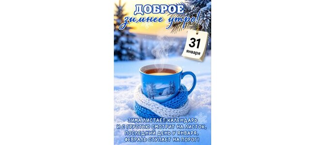 Открытка "ДОБРОЕ ЗИМНЕЕ УТРО! 31 ЯНВАРЯ. ЗИМА ЛИСТАЕТ КАЛЕНДАРЬ И С ГРУСТЬЮ СМОТРИТ НА ЛИСТОК, ПОСЛЕДНИЙ ДЕНЬ"