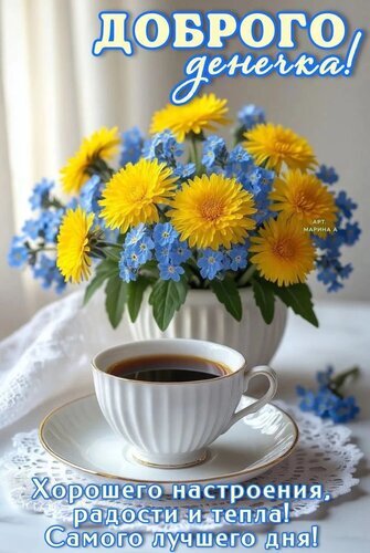 Красочная поздравительная открытка для доброго утра. На изображении представлен яркий букет желтых гербер или хризантем в сочетании с нежно-голубыми незабудками в белой вазе. На переднем плане стоит чашка ароматного черного кофе на блюдце, стоящая на кружевной салфетке. Картинка наполнена солнечным светом и уютом. Текст на русском языке гласит: «Доброго денечка! Хорошего настроения, радости и тепла! Самого лучшего дня!». Идеально подходит для отправки в мессенджерах (WhatsApp, Viber) и социальных сетях как пожелание прекрасного дня близким, друзьям и коллегам.