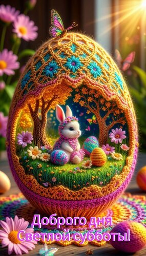 Красочное и уютное изображение к Пасхе, выполненное в стиле реалистичной вязаной игрушки. В центре композиции — декоративное пасхальное яйцо, внутри которого, словно в миниатюрном саду, расположился милый белый кролик. Вокруг кролика — зелёная травка, маленькие цветы и другие пасхальные яйца. Вся сцена пронизана солнечным светом, а сверху приземлилась яркая бабочка. Теплые оттенки розового, желтого и голубого создают атмосферу праздника и весеннего тепла. В нижней части изображения расположена надпись на русском языке: «Доброго дня Светлой субботы!». Идеально подходит для поздравительных открыток и праздничного настроения.