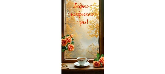 За окном осенний пейзаж, а на подоконнике стоит чашка с горячим кофе и лежат розы