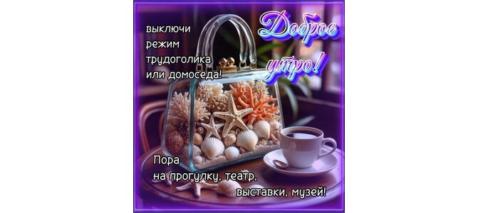 Доброе утро! Полезных прогулок. Выключи режим трудоголика или домоседа! Добров утро! Пора на прогулку, театр, выставки, музей!