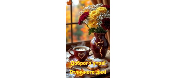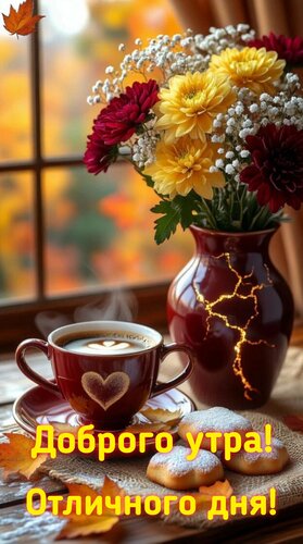На столе стоит чашка с горячим кофе, рядом и ваза с осенними цветами и имбирное печенье