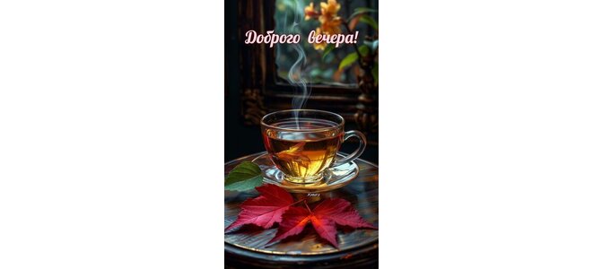 На кофейном столике лежат осенние листья, а на них стоит чашка с горячим чем