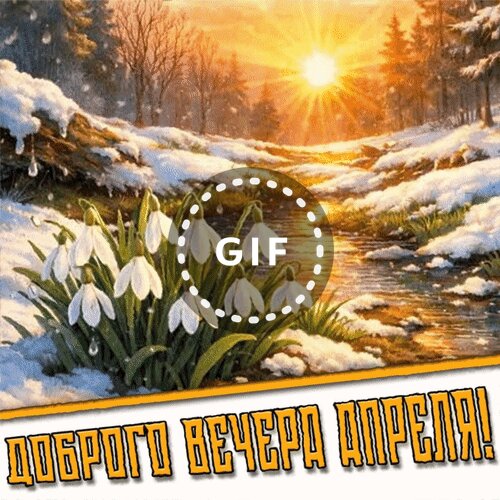 Живописная зимне-весенняя открытка с изображением первых подснежников, пробивающихся сквозь снег. На фоне — солнечный пейзаж с заснеженным лесом и замерзшим ручьем, в котором отражаются лучи закатного или рассветного солнца. Теплая цветовая гамма, создающая атмосферу надежды и пробуждения природы. На картинке присутствует надпись на русском языке: «Доброго вечера, Апреля!». Идеально подходит для поздравлений в мессенджерах и социальных сетях.