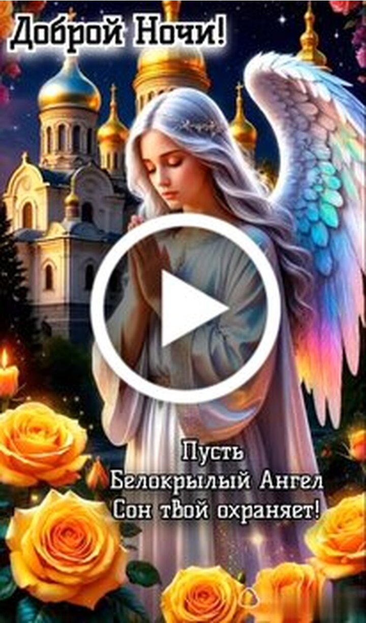 Это атмосферное видео представляет собой спокойную и эстетичную заставку для пожелания доброй ночи. В центре композиции находится прекрасный белокрылый ангел с длинными светлыми волосами, стоящий в молитвенной позе на фоне величественного храма с золотыми куполами. Вокруг ангела распускаются пышные золотистые розы, создавая атмосферу умиротворения и тепла. Видео наполнено светом и нежностью, а надпись на экране гласит пусть белокрылый ангел сон твой охраняет. Видео идеально подходит для того, чтобы отправить близким, подарить им чувство спокойствия и пожелать самого доброго и светлого сна.
